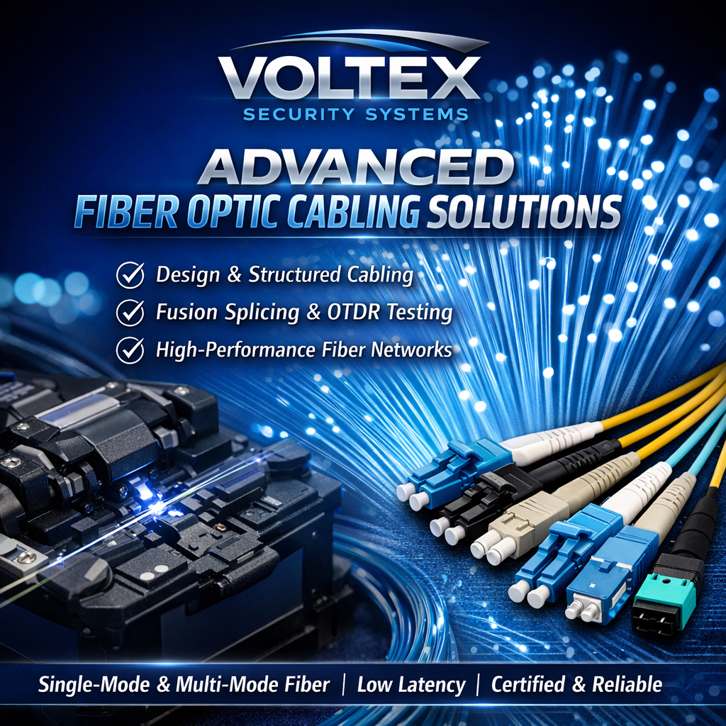 Voltex Security Systems delivers advanced fiber optic cabling solutions including system design, structured cabling, fusion splicing, termination, OTDR testing, and certification.